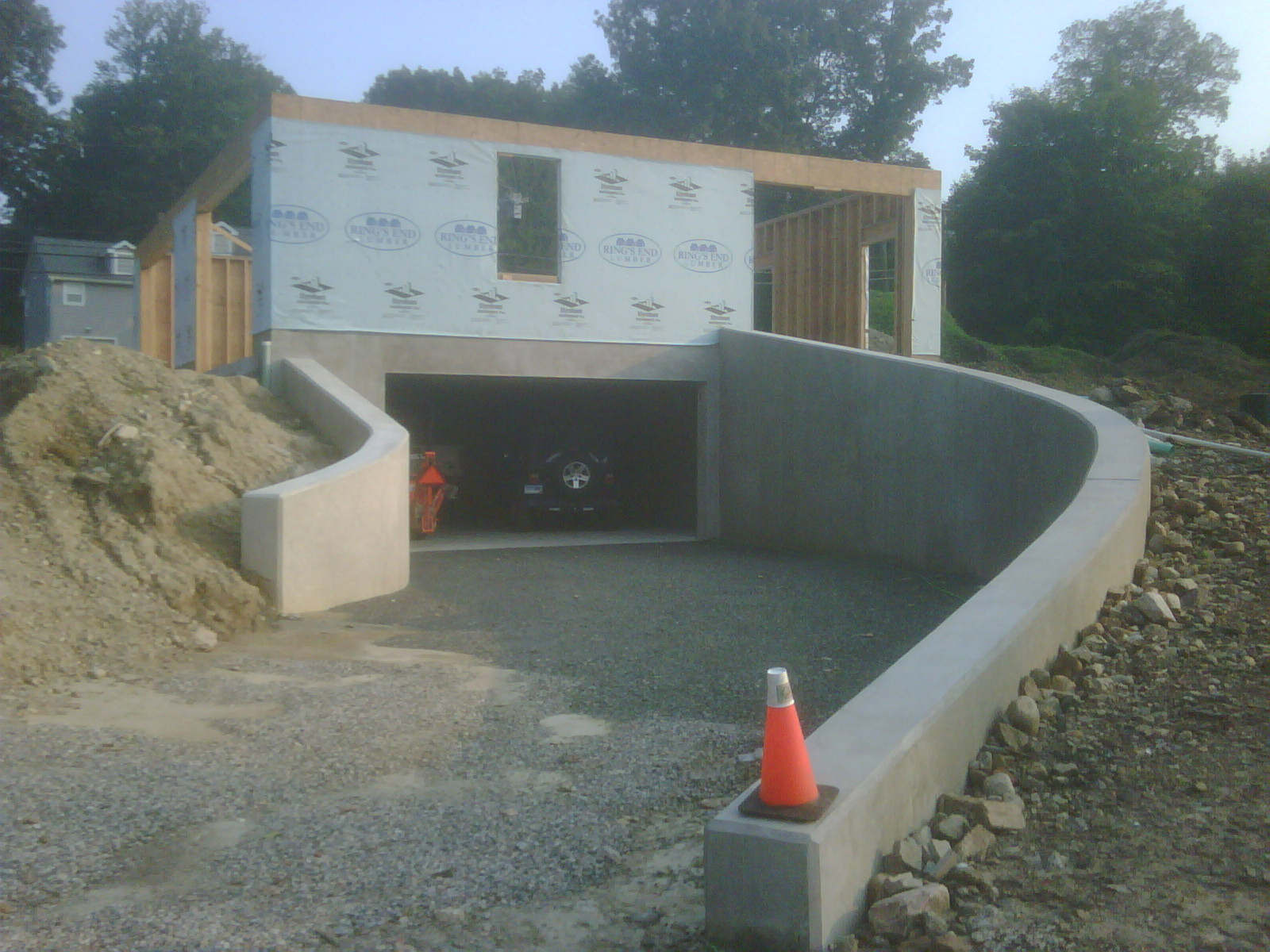 Access at this gable end is split serving upper and lower levels. The right hand retaining wall supports the upper driveway. The upper level garage door opening provides access to the 12’ wide x 48’ long “pass through” garage bay. This allows the owner to pull a truck and trailer into the bay without disconnecting. Another garage door is located at the opposite side of the building. Notice, on the left side of the upper ground level, there are framed openings which will provide 4 parking bays over the basement level.